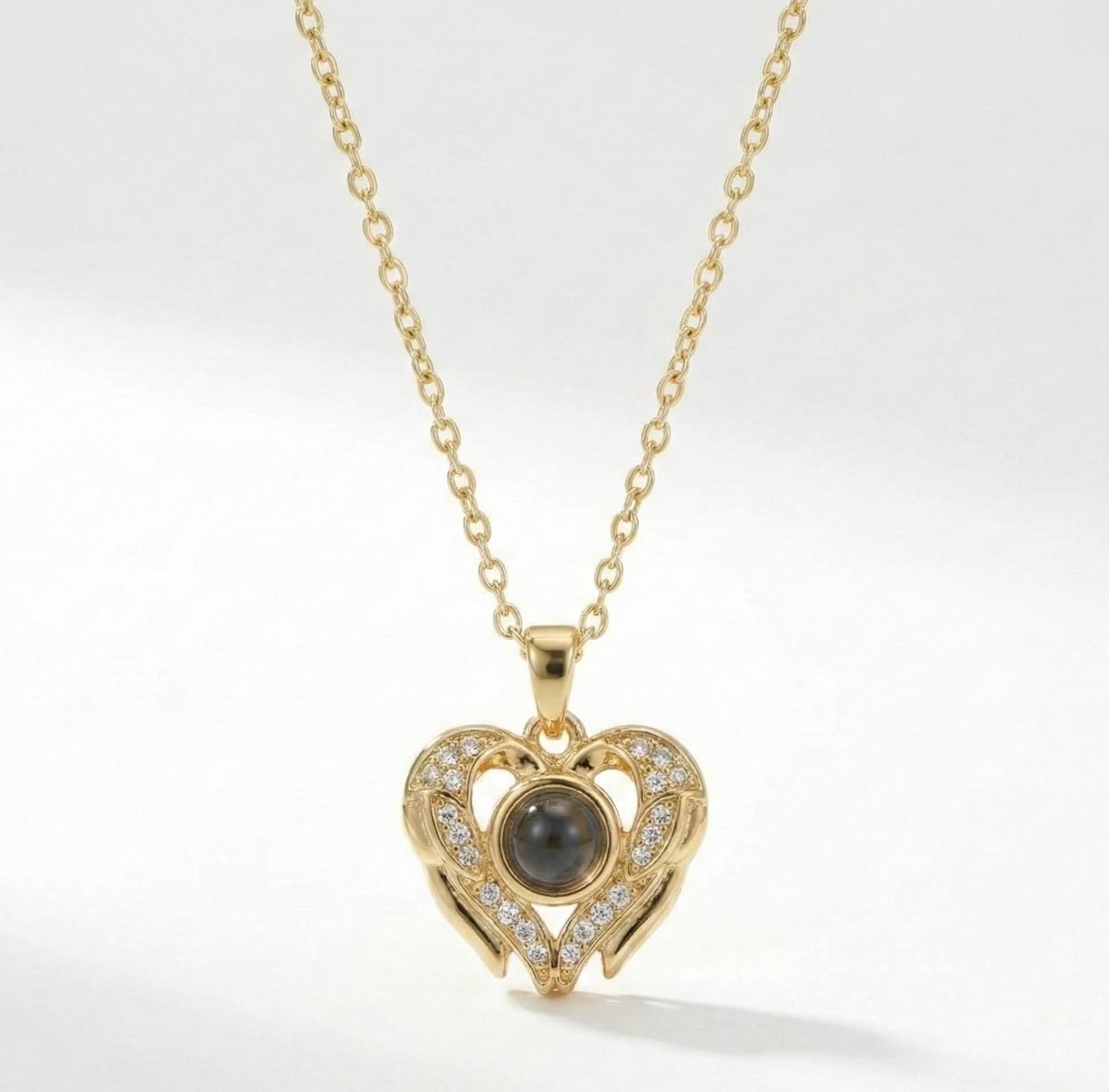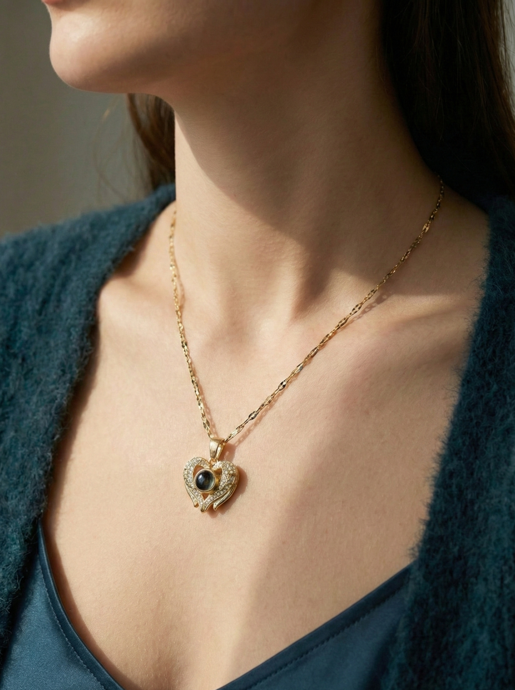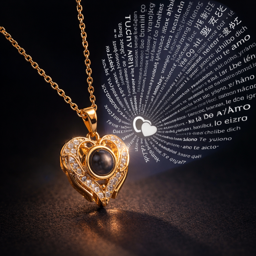 Bu “Seni Seviyorum” kolyesi paslanmaz çelik (stainless steel) gövde üzerine altın renk kaplama ile üretilmiştir. Kalp formundaki detaylar ışıltılı taş süslemeler ile tamamlanırken, merkezdeki projeksiyon/lens kısmı (100 dilde “Seni Seviyorum” yazısını gösteren bölüm) özel cam/lens yapısıyla tasarlanmıştır. Günlük kullanıma uygun, parlaklığını uzun süre korumaya yardımcı dayanıklı bir yapıya sahiptir.
